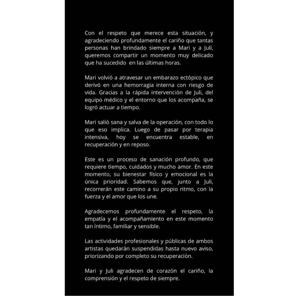 Finalmente, el comunicado concluye agradeciendo el apoyo y respeto del público: "Agradecemos profundamente el respeto, la empatía y el acompañamiento en este momento tan íntimo, familiar y sensible.Las actividades profesionales y públicas de ambos artistas quedarán suspendidas hasta nuevo aviso, priorizando por completo su recuperación. Mari y Juli agradecen de corazón el cariño, la comprensión y el respeto de siempre", cerraron.