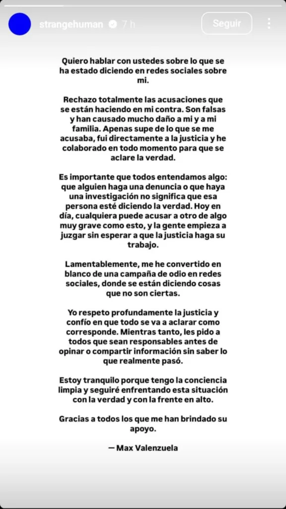 “Mientras tanto, les pido a todos que sean responsables antes de opinar y compartir información sin saber lo que realmente pasó. Estoy tranquilo porque tengo la conciencia limpia y seguiré enfrentando esta situación con la verdad y con la frente en alto”, agregó Max Valenzuela destacando a quienes le han brindado su apoyo.