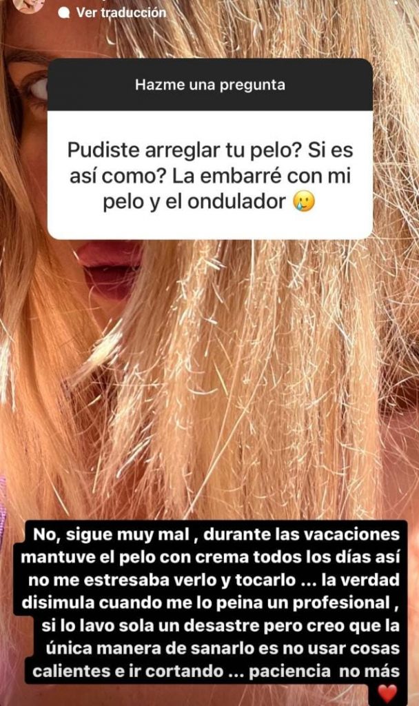 En sus historias de Instagram, contó: "Miren mi gente esto, por favor. Llevaba años, no sé cuántos, una sin teñirme el pelo, sin hacerme nada más que las cremas de ‘CLo’ (su marca) y se me ocurrió hacerme un bótox capilar. Se me cortó todo el pelo y me quedó todo el pelo una virutilla. Les juro que estoy mal, pero mal".