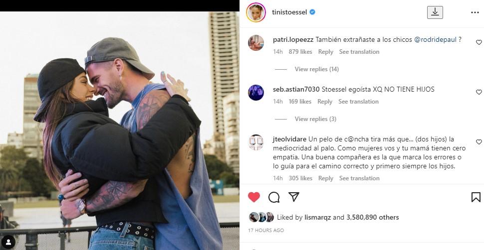 Algunos de los comentarios fueron: "Stoessel egoísta XQ NO TIENE HIJO". "También extrañaste a los chicos @rodridepaul ?". "Un pelo de c***cha tira más que... (dos hijos) la mediocridad al palo. Como mujeres vos y tu mamá tienen cero empatia. Una buena compañera es la que marca los errores o lo guía para el camino correcto y primero siempre los hijos". "Dejen de pedirle que vaya a ver sus hijos casi obligado. Ya demostró que no son su prioridad. Es solo papá billetera. Ojalá esos niños algún día encuentren un verdadero padre... ya que padre no es el que los engendra". "@tinistoessel DEJÁ QUE @rodridepaul VEA A SUS HIJOSSSS!! DEJÁ DE COMPETIR CON NENES". "Si fueras más inteligente Tini le recomendarías estar con sus hijos. Su hijita tiene la misma camiseta puesta hace días. De paul no fue capaz de nombrarlos en todo el mundial y lo primero que hizo fue ir a verte". "@rodridepaul @tinistoessel hay niños que deberían tener prioridad 😢".