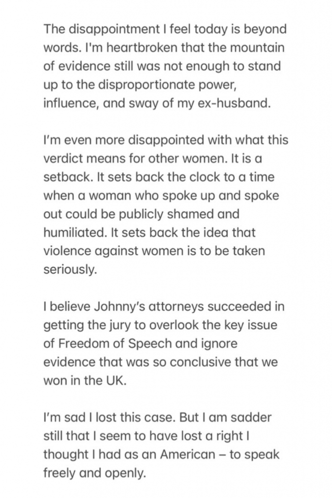 Amber Heard compartió un comunicado a través de sus redes sociales, donde indica: "La decepción que siento hoy está más allá de las palabras. Estoy desconsolada porque la gran cantidad de evidencia aún no fue suficiente para hacer frente al poder e influencia desproporcionados de mi ex esposo".