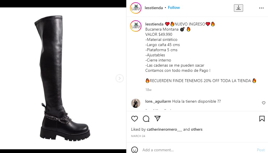 Según lesstienda, la cuenta de Instagram que comercializa las botas que lleva Gala Caldirola, el valor es de $49.990. Son unas bucaneras Montana con 45 cm de largo. Además, tienen una plataforma de 5 cm. Son ajustables, con cierre interno y las cadenas pueden sacarse cuando quieran.
