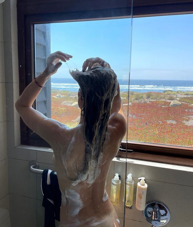 "Del Mar a la ducha con vista al mar 🌊#tbt de un momento y lugar mágico", escribió ella al pie de las postales.