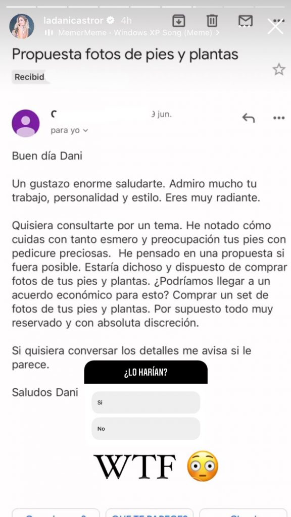 "Podríamos llegar a un acuerdo económico para esto comprar un Set de fotos de tus pies y plantas por supuesto todo muy reservado y con absoluta discreción" concluye la propuesta a Dani Castro.
