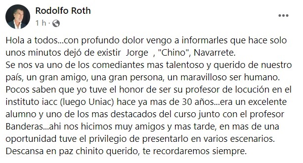 "Hola a todos... Con profundo dolor vengo a informarles que hace solo unos minutos dejó de existir Jorge "Chino" Navarrete. Se nos va uno de los comediantes más talentosos y queridos de nuestro país, un gran amigo, una gran persona, un maravilloso ser humano", comenzó relatando Rodolfo Roth.