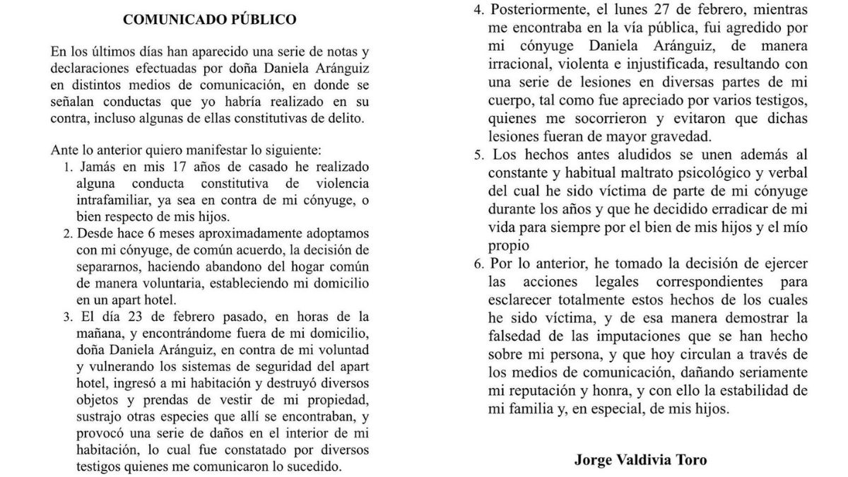 “En los últimos días han aparecido una serie de notas y declaraciones efectuadas por doña Daniela Aránguiz en distintos medios de comunicación. En donde se señalan conductas que yo habría realizado en su contra, incluso algunas de ellas constitutivas de delito”, partió escribiendo.