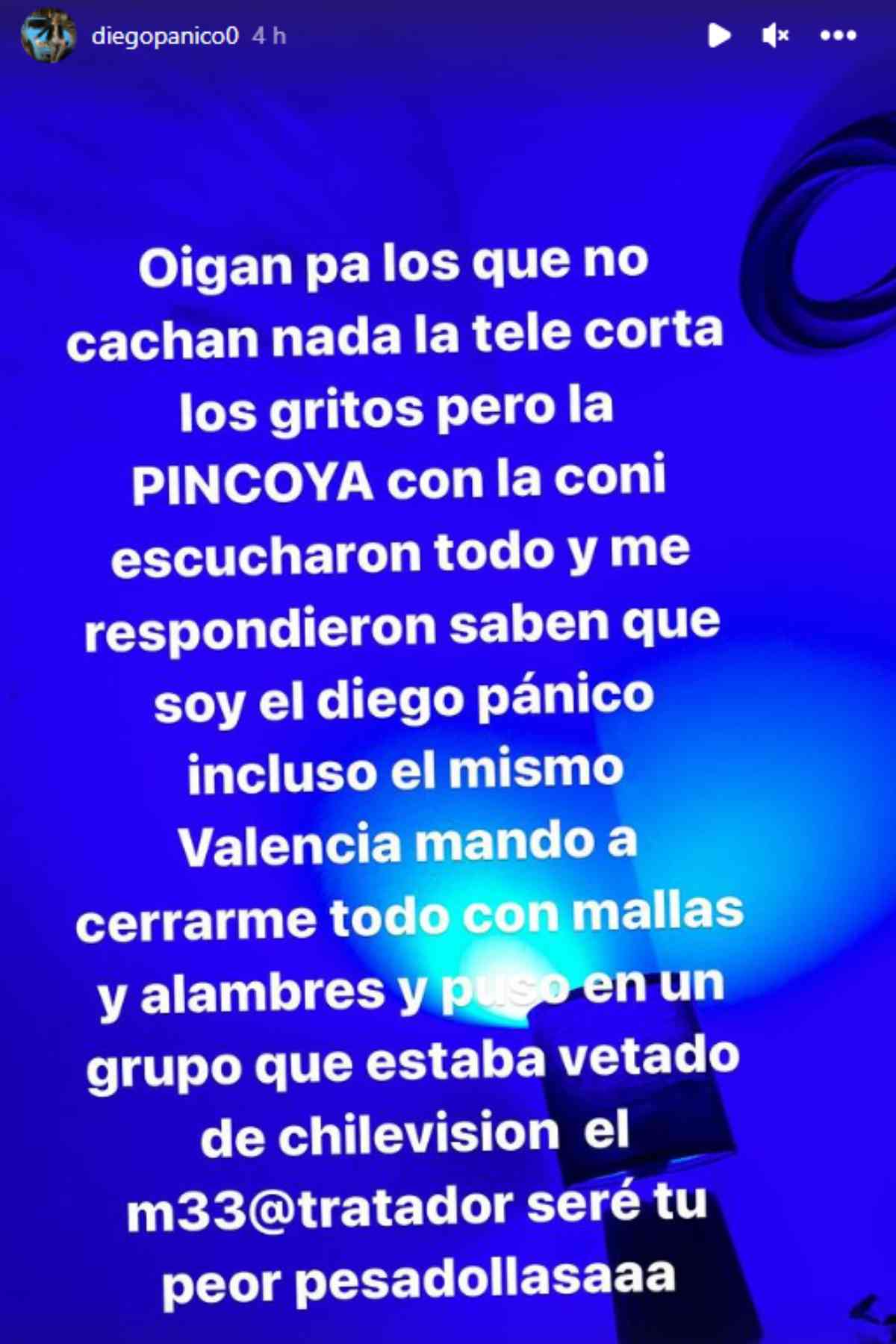 En esa línea, agregó que "incluso el mismo (productor Carlos) Valencia mandó a cerrarme todo con mallas y alambres, y puso en un grupo que estaba vetado de Chilevisión. El maltratador, seré tu peor pesadilla".