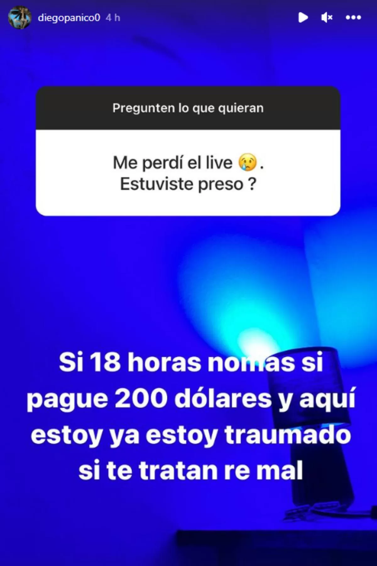 "18 horas no más, si pagué 200 dólares y aquí estoy. Ya estoy traumado, si te tratan re mal", confesó Diego Pánico en una dinámica de preguntas y respuestas.