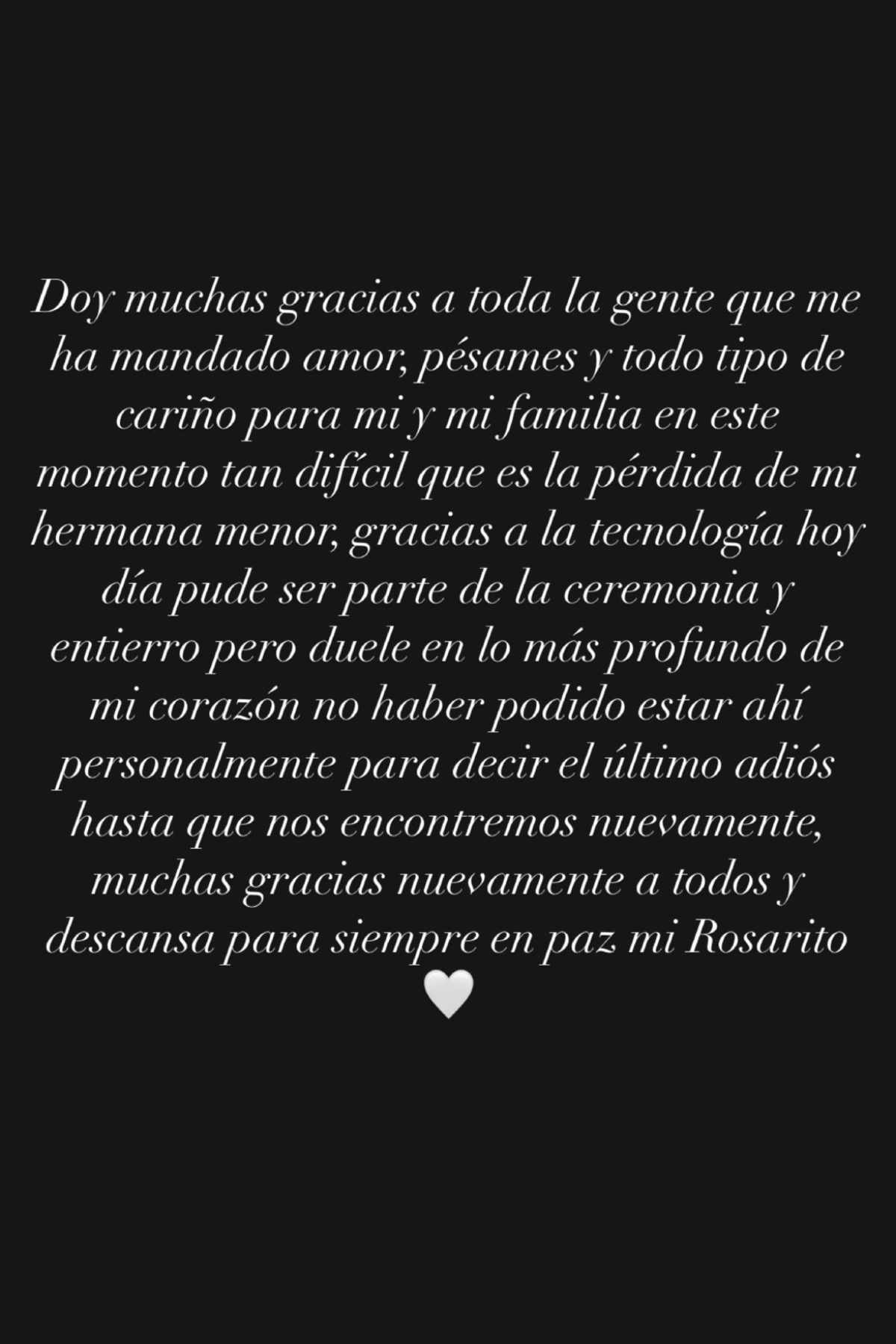 Luego contó que no pudo asistir al funeral presencialmente, pero sí se lo mostraron. "Gracias a la tecnología hoy día pude ser parte de la ceremonia y entierro. Pero duele en los más profundo de mi corazón no poder haber estado ahí personalmente para decir el último adiós hasta que nos encontremos nuevamente", confesó.
