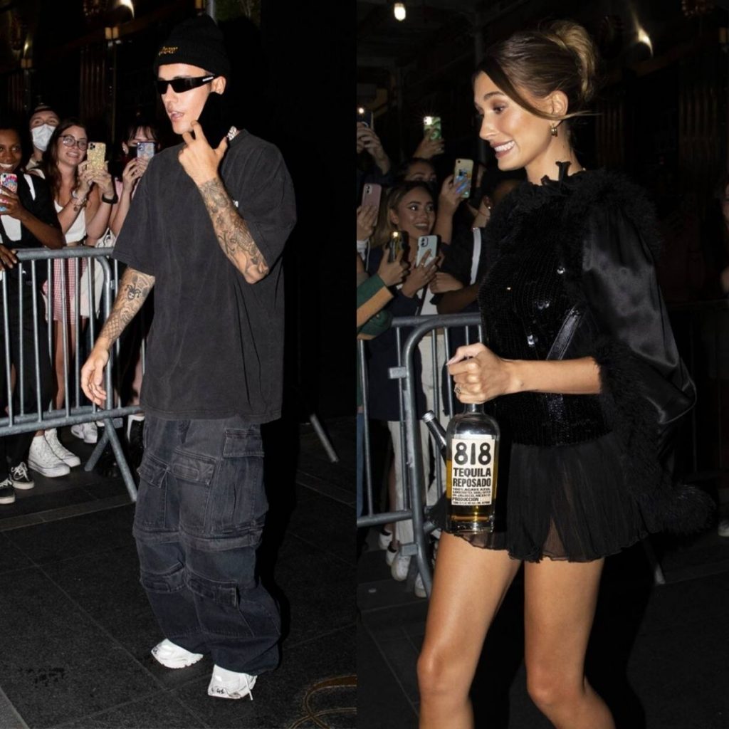 Justin Bieber, quien actuó en la Met Gala, se cambió a una camiseta y pantalones oscuros. Hailey también llevaba una botella de tequila 818 de su amiga Kendall.