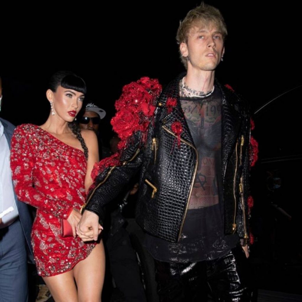 Megan Fox usó un mini vestido rojo asimétrico de un solo hombro, mientras que Machine Gun Kelly lució una chaqueta negra forrada con rosas sobre una camisa transparente y pantalones negros.