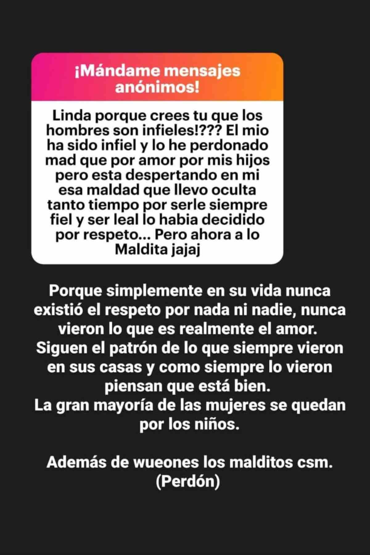 Pero el descargo de la esposa de Jean Paul Pineda no quedó ahí, porque además agregó que los hombres infieles "siguen el patrón de lo que siempre vieron en sus casas. Y como siempre lo vieron piensan que está bien".