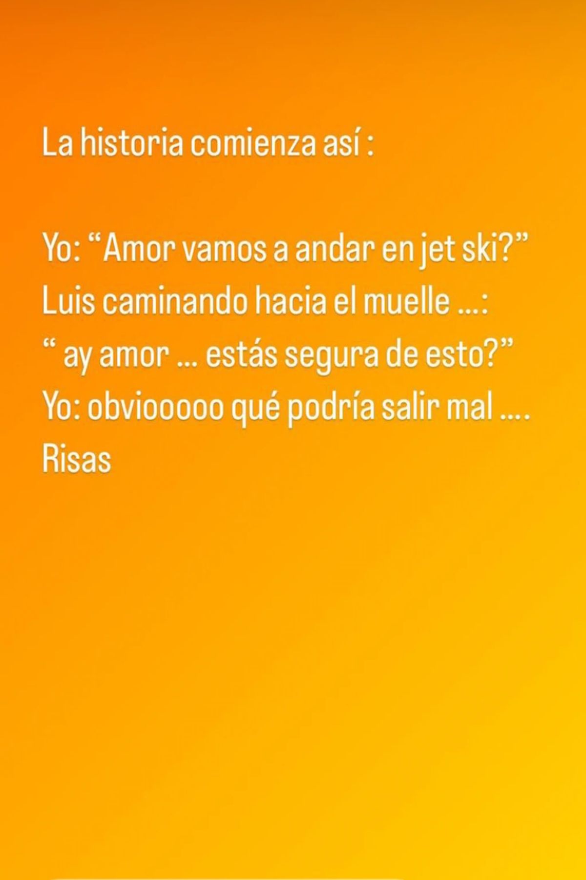 "La historia comienza así: Yo 'amor vamos a andar en jet ski?' Luis caminando hacia el muelle...: 'ay amor... estás segura de esto?' Yo: obviooo qué podría salir mal.... risas", comenzó contando en sus historias.