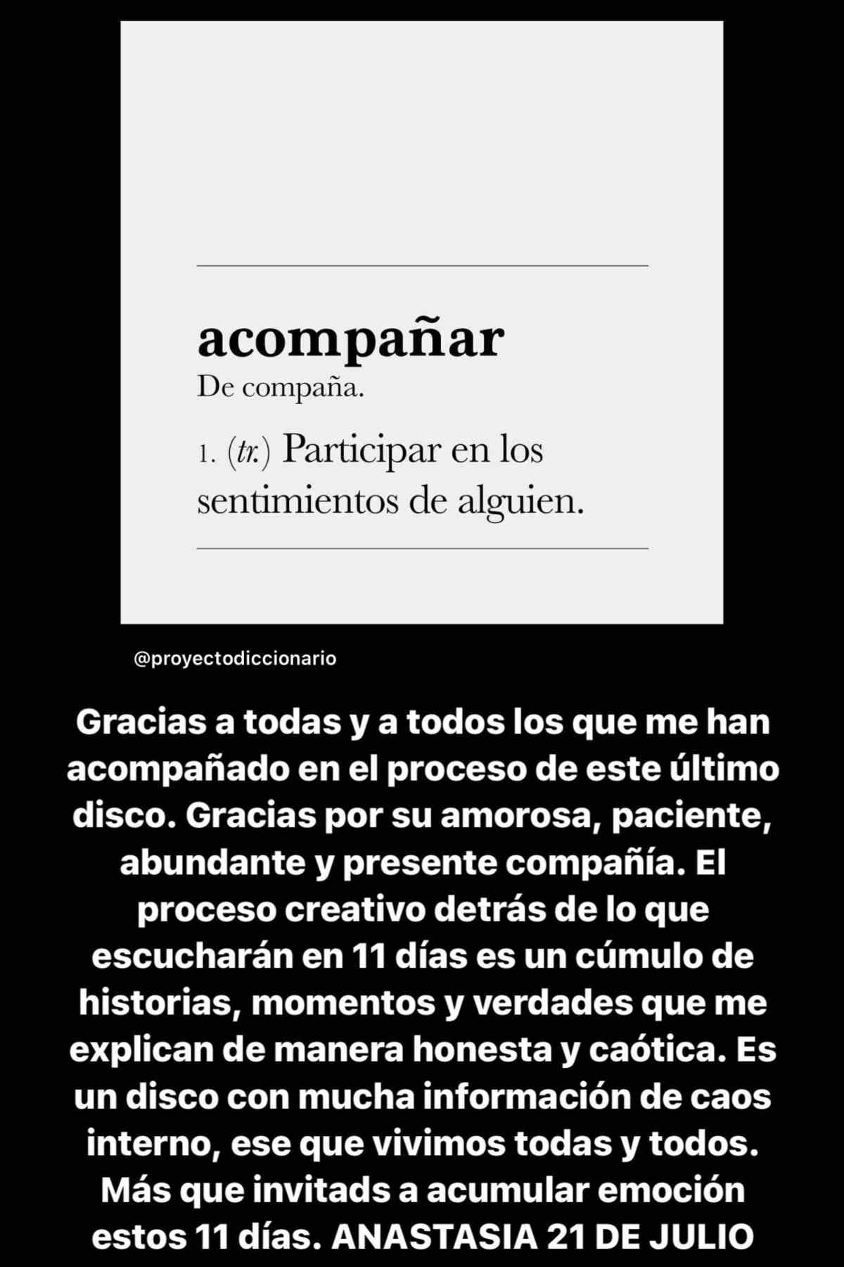 "Es un disco con mucha información de caos interno, ese que vivimos todas y todos. Más que invitadxs a acumar emoción estos 11 días. ANASTASIA 21 DE JULIO", cerró.