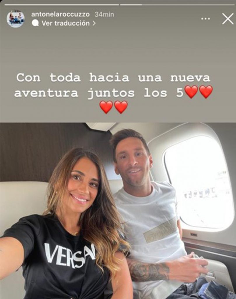 "Con toda hacia una nueva aventura. Juntos los 5", escribió Antonela Roccuzzo sobre una selfie junto a Messi desde el avión, antes de despegar del aeropuerto de Barcelona.