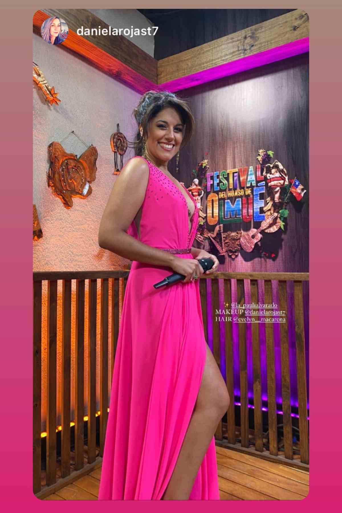 Luego Paulina Alvarado contó que "Bernardo Santander confeccionó, creó, y realizó el vestido que usé en esta primera noche. Un vestido de gaza color fucsia, con escote pronunciado, un tajo en la pierna y cola. ¡Tiene mil cristales puestos totalmente a mano!".