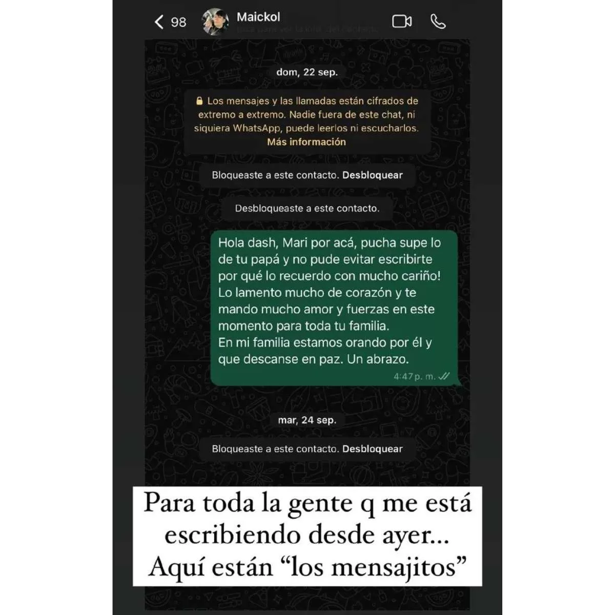La joven mostró el pantallazo del mensaje: "Hola, Dash. Mari por acá. Pucha, supe lo de tu papá y no pude evitar escribirte porque lo recuerdo con mucho cariño. Lo lamento mucho de corazón, y te mando mucho amor y fuerzas en este momento para toda tu familia. En mi familia estamos orando por él y que descanse en paz. Un abrazo", fue parte del escrito.