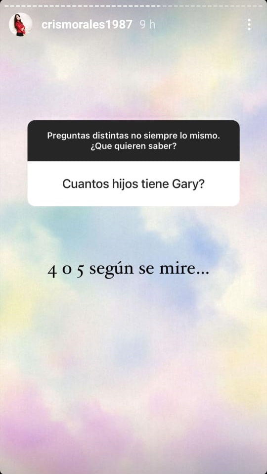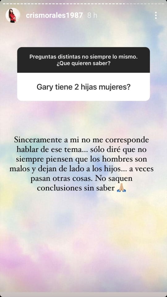 Tras la respuesta de Cristina Morales, otro internauta preguntó: "¿Gary tiene dos hijas mujeres?". Ella o dudó en ser clara: "Sinceramente a mi no me corresponde hablar de ese tema… Solo diré que no siempre piensen que los hombres son malos y dejan de lado a los hijos. A veces pasan otras cosas. No saquen conclusiones sin saber".