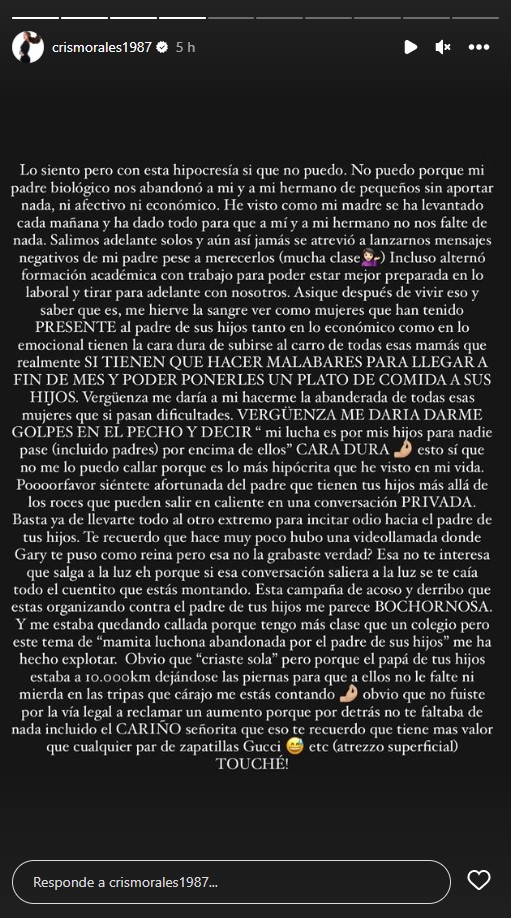 “Así que después de vivir eso y saber qué es, me hierve la sangre ver cómo mujeres que han tenido presente al padre de sus hijos tanto en lo económico como en lo emocional. Tienen la cara dura de subirse al carro de todas esas mamás que realmente sí tienen que hacer malabares para llegar a fin de mes”, continuó expresando Morales.