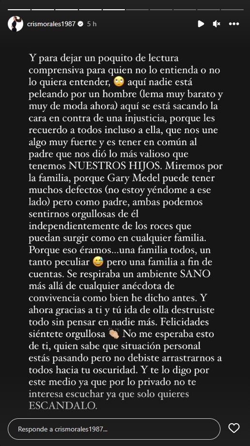 A través de la cuenta oficial de Instagram, Cristina Morales dio a conocer su opinión tras toda la polémica generada en contra de Gary Medel, defendiéndolo de la funa que protagonizó Alejandra..