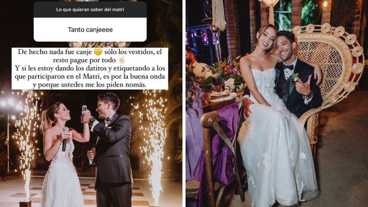 Luego, en otra historia agregó: “Para aclarar un poquito este comentario. Nada del matri fue canje, todo lo pagamos, todito, cada peso yo con Samito”.