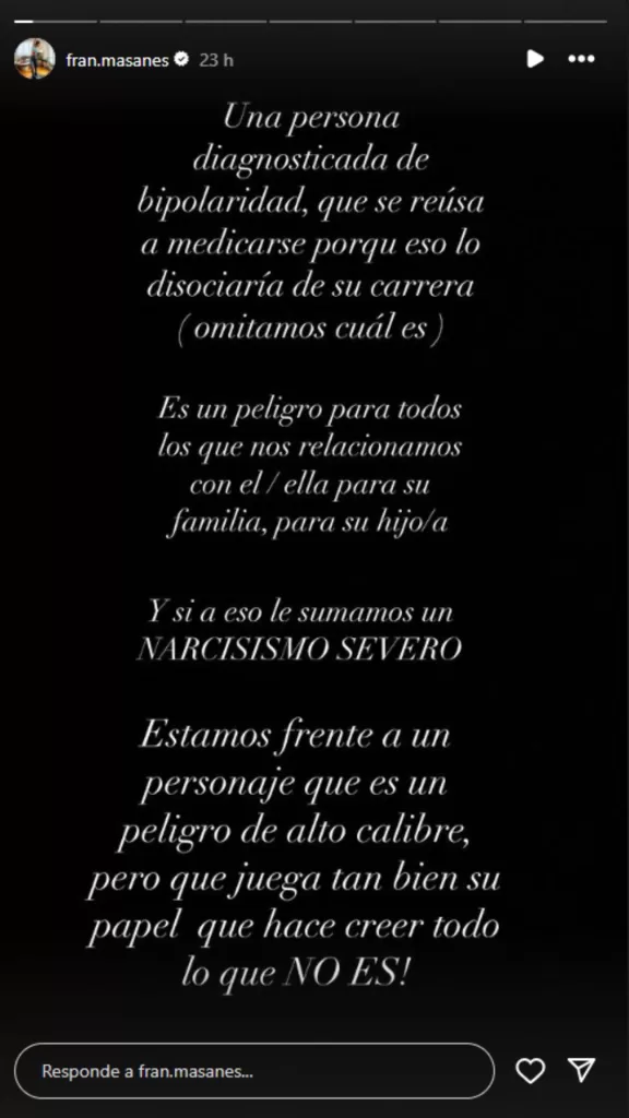"Una persona diagnosticada de bipolaridad, que se reúsa a medicarse porque eso lo disociaría de su carrera (omitamos cuál es) es un peligro para todos los que nos relacionamos con el, ella. Para su familia, para su hijo/a", detalló.