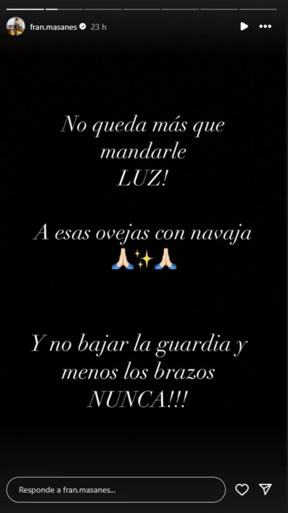"Mucha luz para ti, que te miras el ombligo pero también estas stories", agregó Fran Masanes tirándole un beso a la cámara. Sin revelar el nombre de a quién iban dirigidas sus palabras, sin embargo usuarios apuntaron a su expareja. Claudio Castellón, quien trabaja actualmente en el remake de Amores de Mercado.
