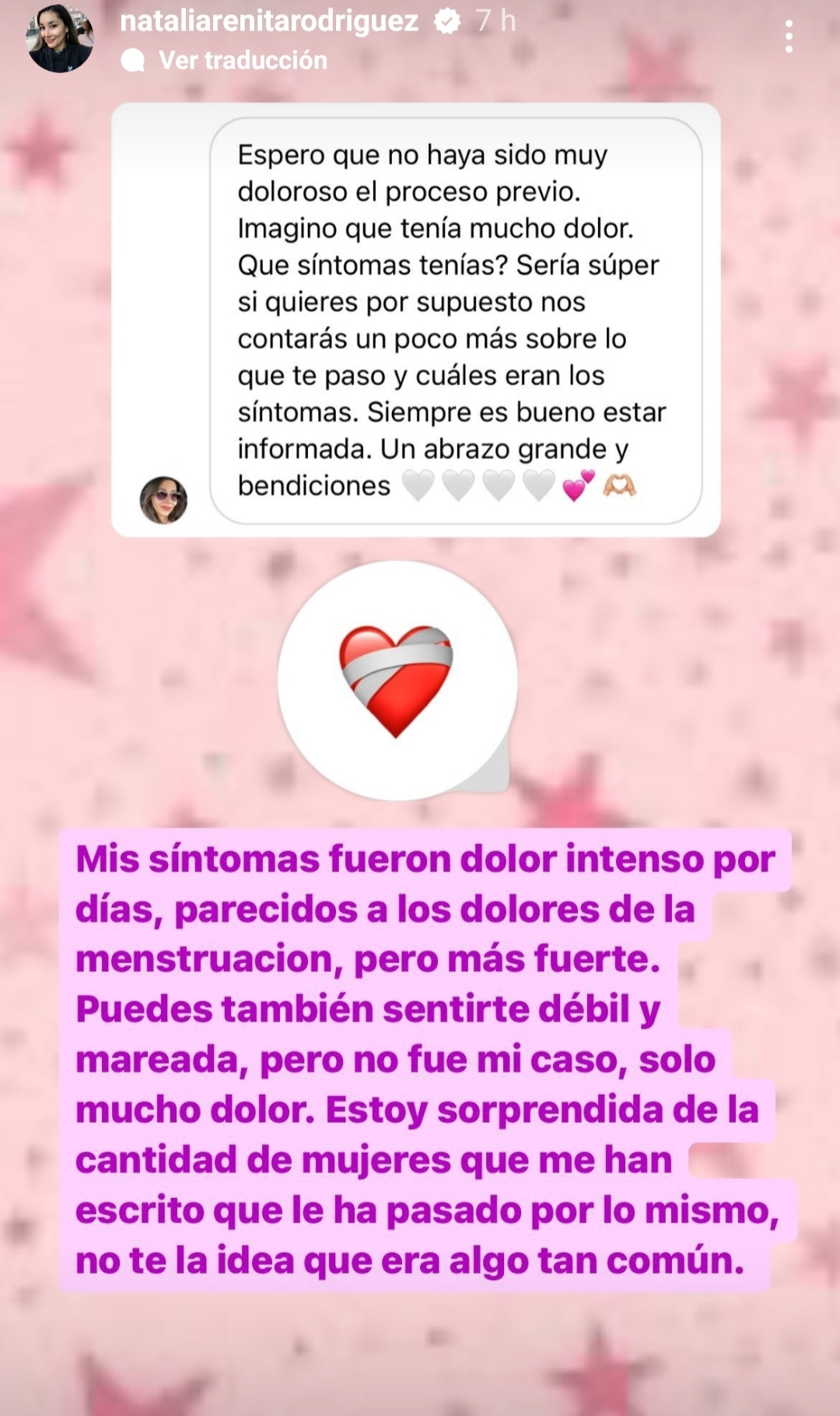"Puedes también sentirte débil y mareada, pero no fue mi caso, solo mucho dolor. Estoy sorprendida de la cantidad de mujeres que me han escrito que han pasado por lo mismo. No tenía idea de que era algo tan común", cerró Natalia Rodríguez.