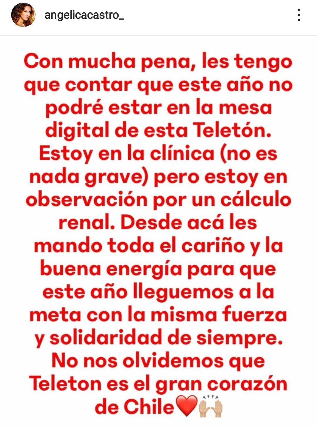 "No nos olvidemos que siempre Teletón es el gran gran corazón de Chile", remató Angélica Castro a través de una historia que subió este jueves a su cuenta de Instagram.