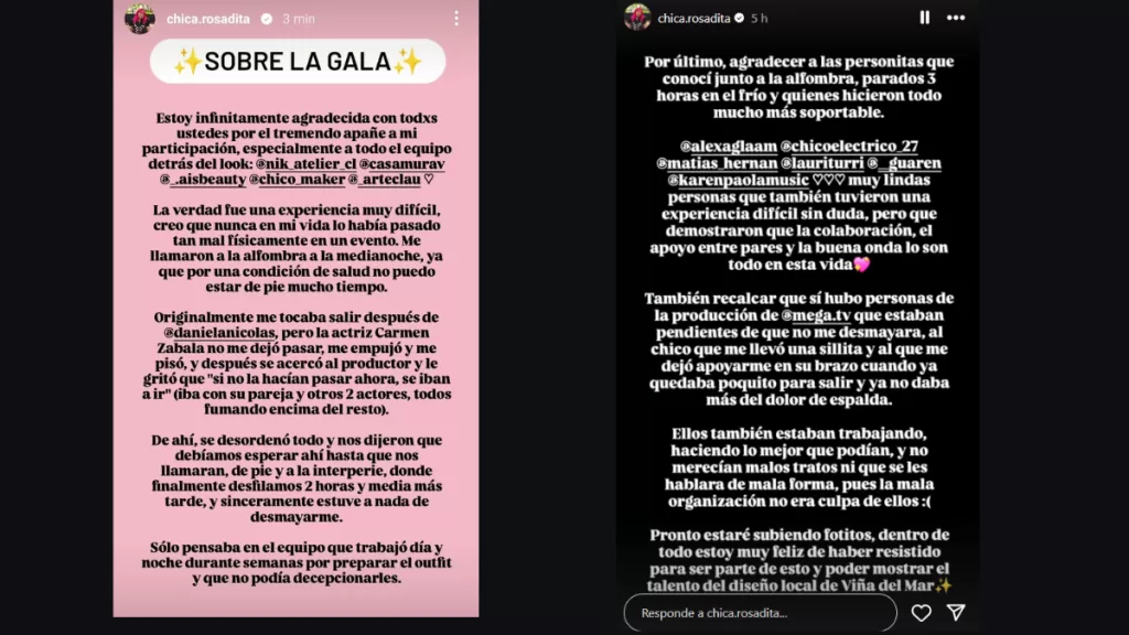 Es en este contexto que la influencer y activista por los derechos digitales, Valentina Muñoz Rabanal, también conocida como "Chica rosadita", publicó en historias de su Instagram que vivió una compleja situación en el previo a desfilar.