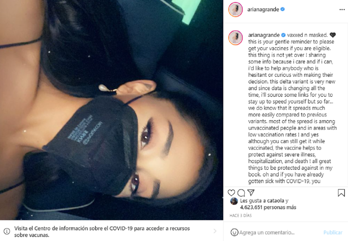 A ellos se suman, Ariana Grande, quien a través de sus redes sociales ha animado a la gente a que realicen su proceso de vacunación. "Este es un amable recordatorio para vacunarse si se puede. Esto aún no ha terminado" declaró la artista.