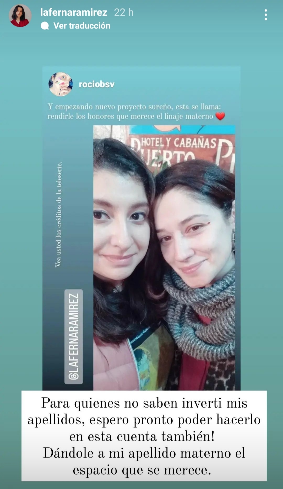 "Para quienes no saben, invertí mis apellidos. Espero pronto poder hacerlo en esta cuenta también! Dándole a mi apellido materno el espacio que se merece", expresó la actriz al replicar una foto en la que aparece junto a una continuista de Mega.