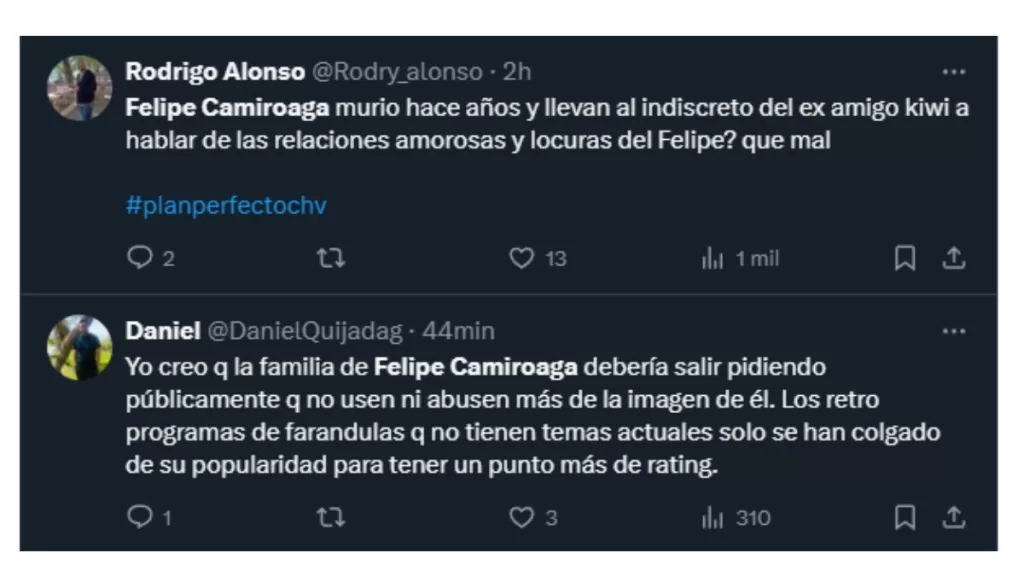 "No hay peor amigo que el #Kiwi lo que sucede entre amigos queda entre amigos, ahora este tipo lucrando con la vida de #FelipeCamiroaga ¡No lo contraten! No lo queremos ver ¡traidor!" o "Alcancé a ver 2 minutos de #PlanPerfectoCHV y estaba el Kiwi y la Cecilia Gutiérrez hablando de los amoríos de Felipe Camiroaga, déjenlo descansar en paz!! Cuál es la idea de esa tipa de contar q andaba con 2 mujeres a la vez. Era joven y soltero. Libre para hacer lo q quiera!!", agregaron en las redes criticando duramente al show.
