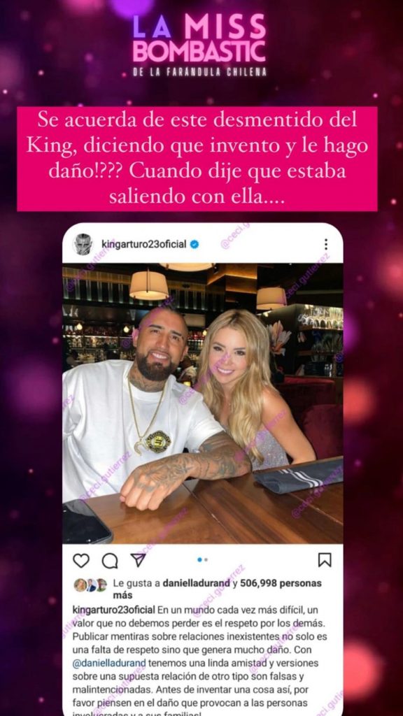 Luego, Cecilia Gutiérrez agregó el desmentido que hizo Arturo Vidal cuando ella reveló que tendría un romance con Daniella Durán. "Se acuerdan de este desmentido del King, diciendo que invento y le hago daño!??? Cuando dije que estaba saliendo con ella...", precisó.
