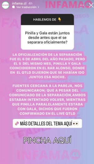 El portal web redobló la apuesta y afirmó: "Fuentes cercanas a la pareja nos comunicaron que, a pesar del comunicado de la separación, ambos (Mauricio Pinilla y Gissella Gallardo) estaban intentando volver, mientras que Pinilla, paralelamente estaba con Gala Caldirola, dichos que fueron confirmados en el live de QTLD".