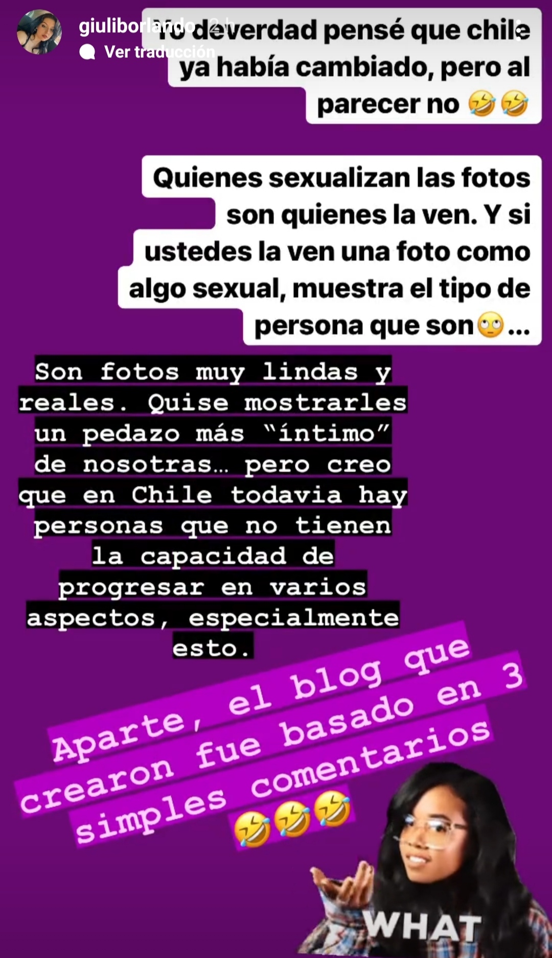 "Son fotos muy lindas y reales. Quise mostrarles un pedacito más íntimo de nosotras, pero creo que en Chile todavía hay personas que no tienen la capacidad de progresar en varios aspectos", agregó Guiliana.