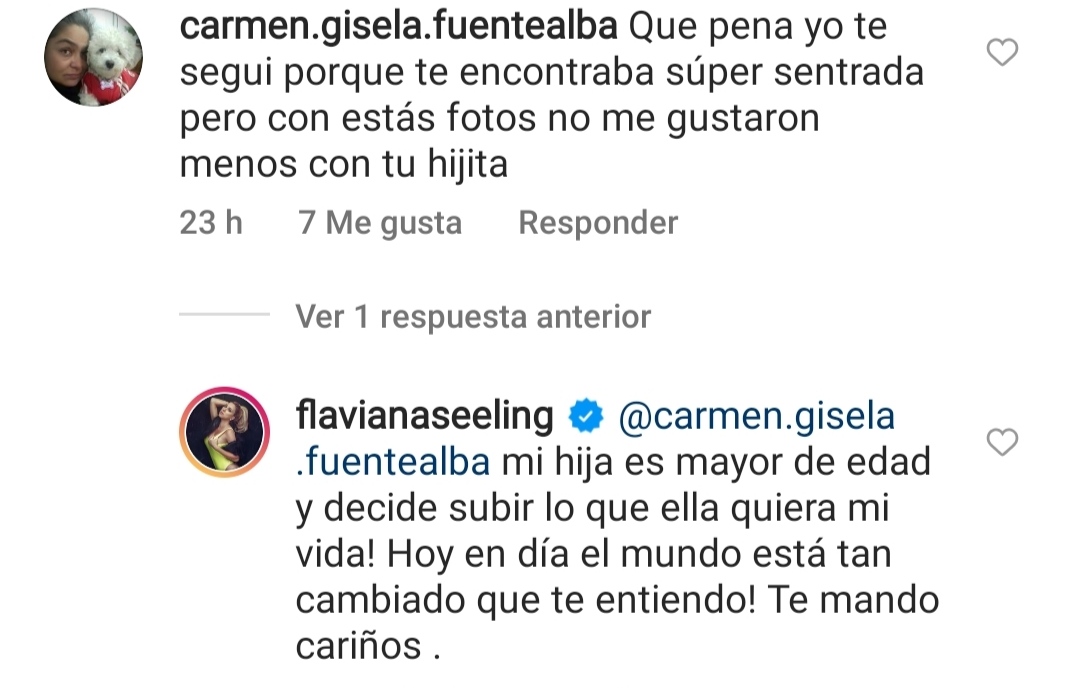 "Vergonzoso, un poco de pudor" y "no está bien este tipo de fotografías junto a su hija, no es necesario tan destape", fueron algunos de los mensajes que recibió Flaviana Seeling.
