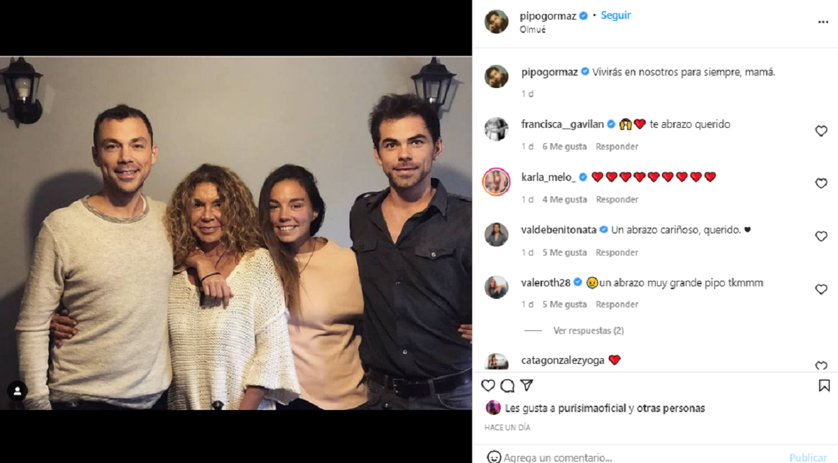 "Vivirás en nosotros para siempre, mamá", fue la breve descripción que Francisco escribió en el posteo. Junto al mensaje, Pipo Gormaz, publicó una fotografía donde aparece junto a sus hermanos y su madre.