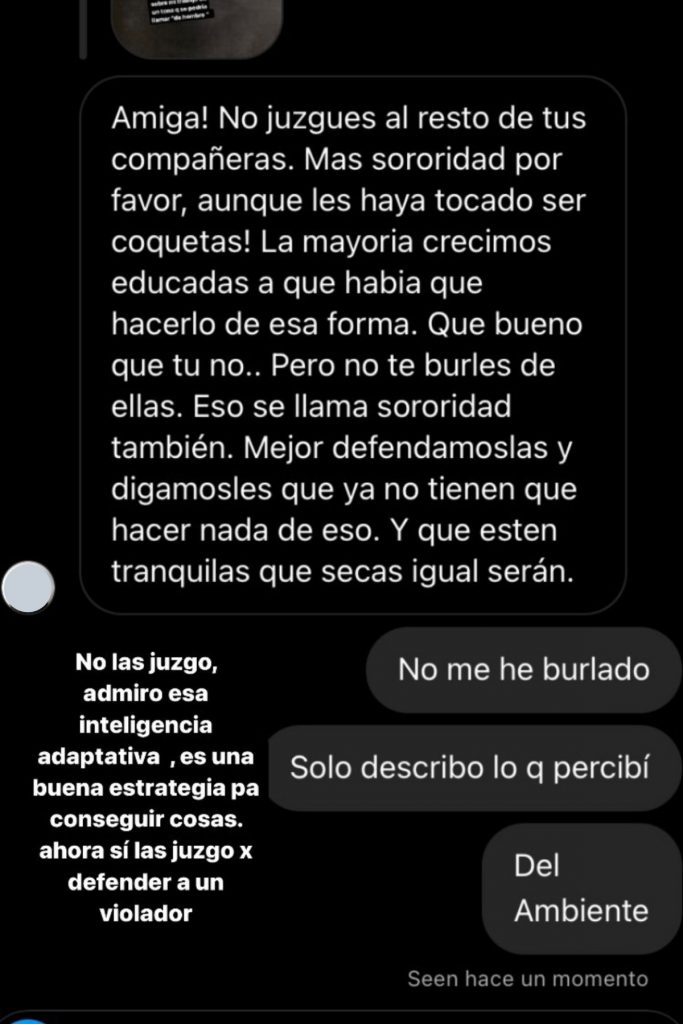 La artista contestó, “No las juzgo, admiro esa inteligencia adaptativa. Es una buena estrategia para conseguir cosas”. Y para finalizar señaló, “Ahora, sí las juzgo por defender a un violador”.
