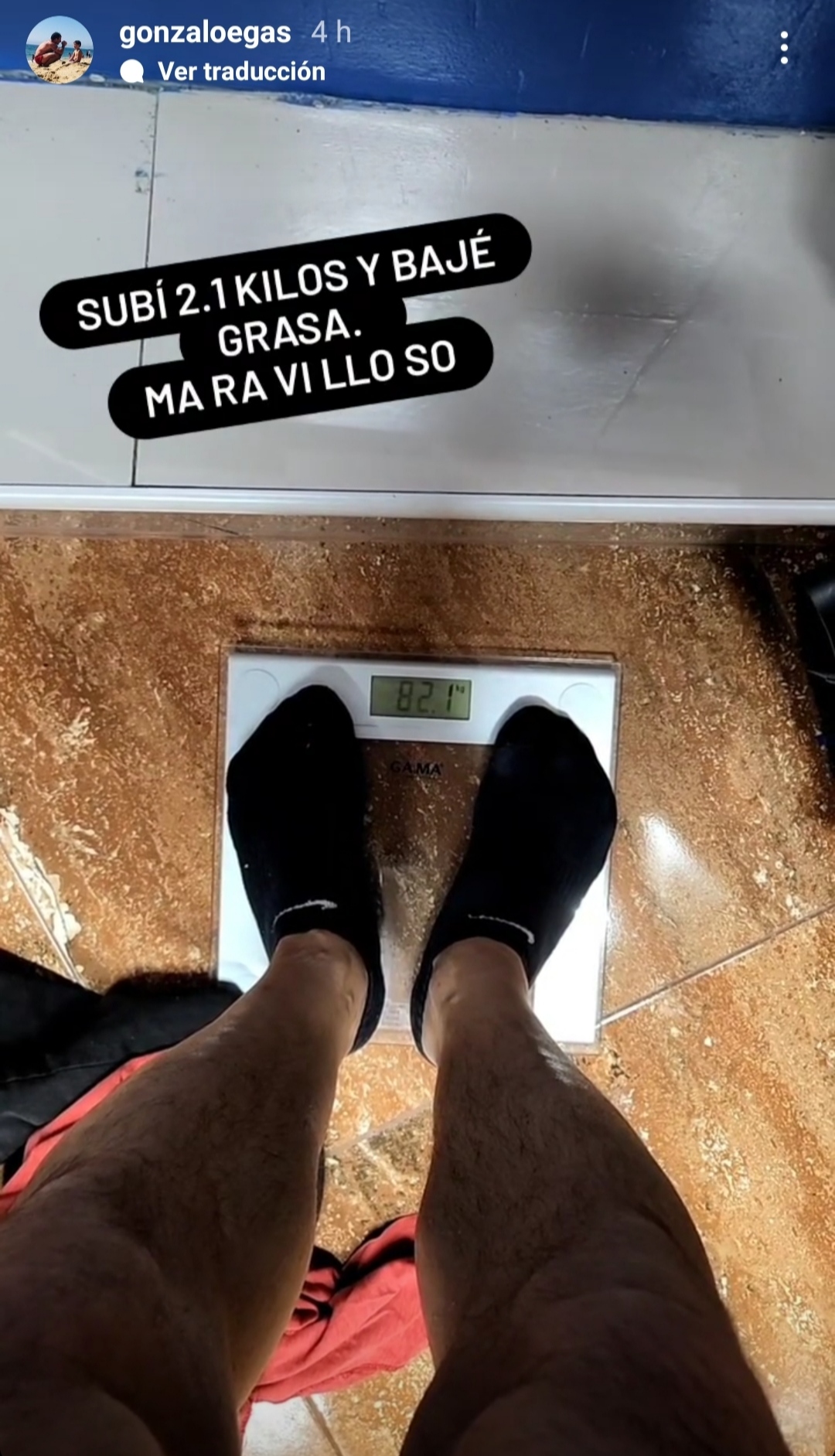 "Vengo saliendo del gimnasio y me acabo de pesar, 82 kilos 100 gramos; hace hace dos semanas estaba 79,900, subí casi 2 kilos 200. Gracias Vivien Leona Hauva por tu asesoría desde México", añadió el ex de Wilma González en un video que subió al formato Historias.