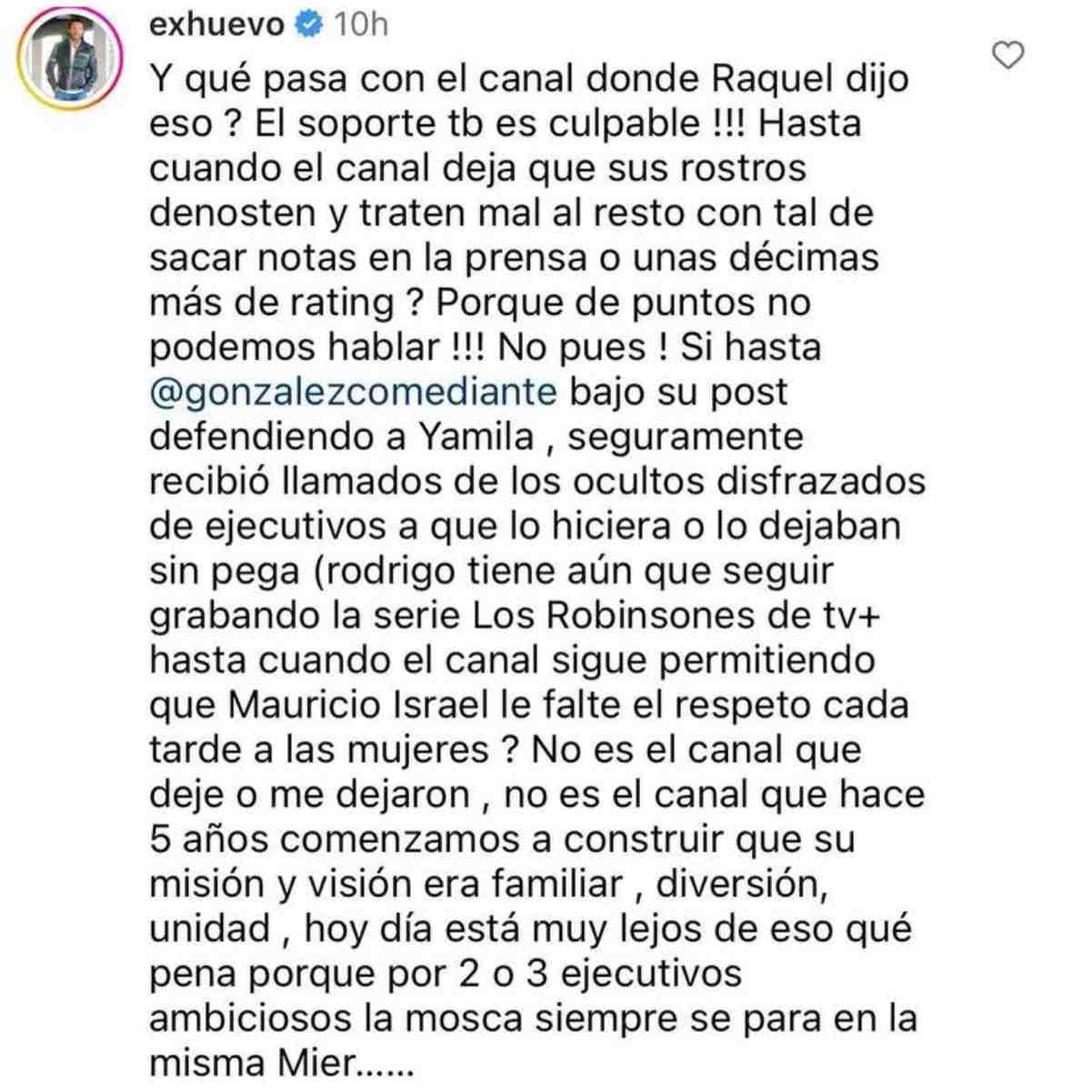 “¿Y qué pasa con el canal donde Raquel dijo eso? El soporte también es culpable, ¿hasta cuándo el canal deja que sus rostros denosten y traten mal al resto con tal de sacar notas en la prensa o unas décimas más de rating. Porque de puntos no podemos hablar. No pues”, escribió.