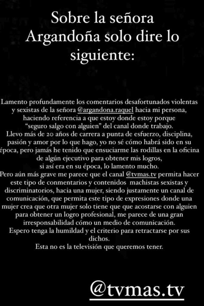 Este hecho, fue repudiado por la misma Yamila Reyna, quien no dudó en dejarle un claro y directo mensaje a Raquel Argandoña en un post del portal TiempoX: “Qué pena que creas que una mujer no puede tener un puesto solo por su trabajo y esfuerzo. Llevo más de 20 años de trabajo, no tengo que acostarme con alguien para ser quien soy”, escribió.