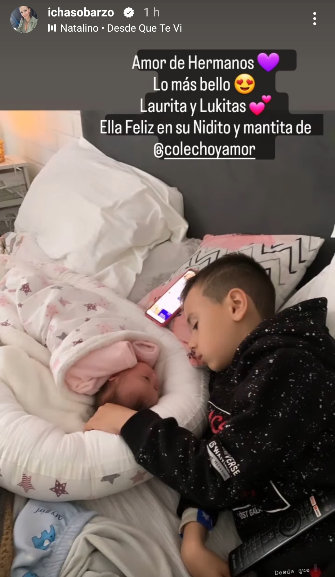 "Amor de hermanos. Lo más bello.... Laura y Lukitas. Ella feliz en su nidito y mantita", comentó la bailarina de 39 años para acompañar la postal.