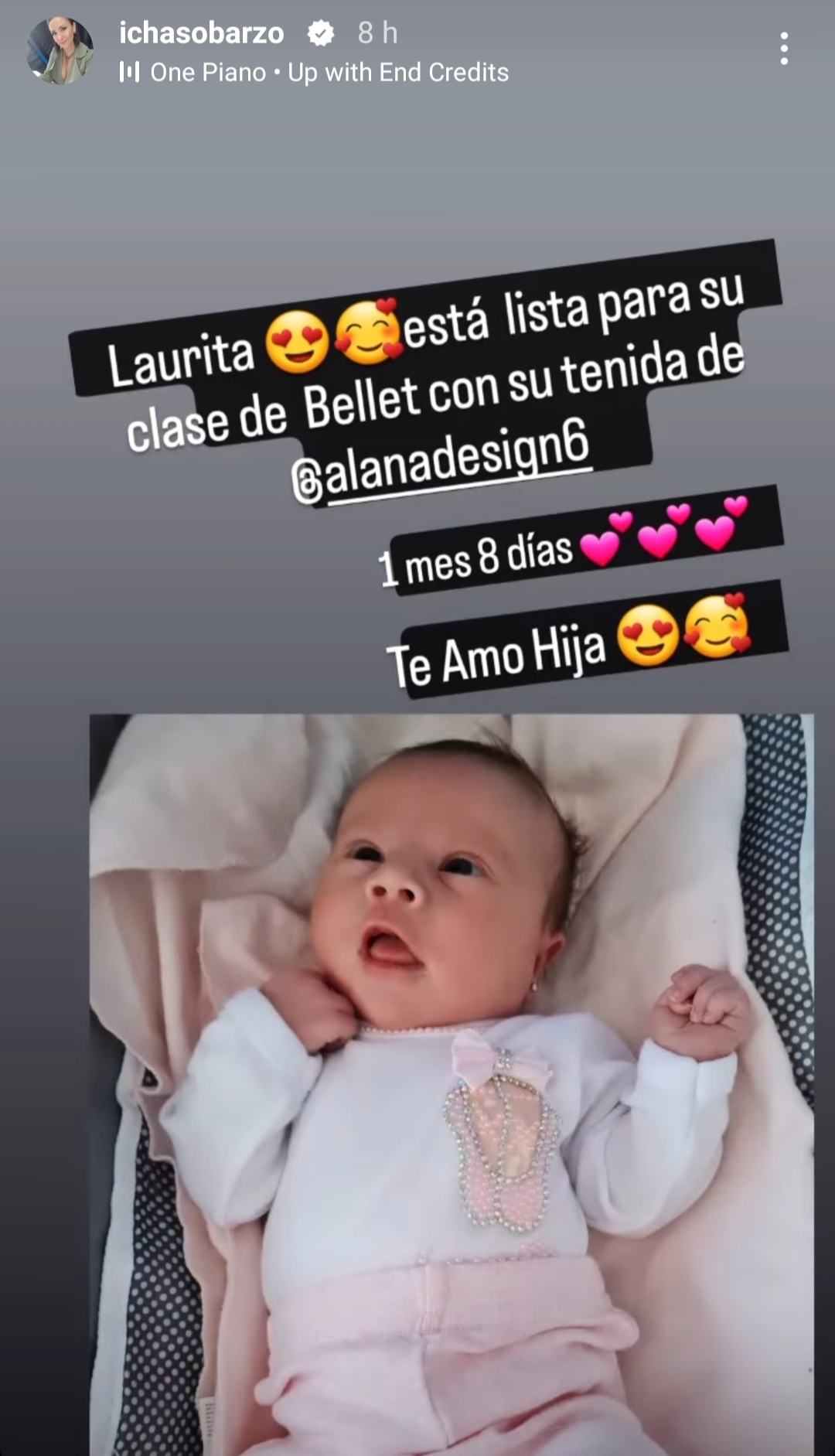 "Laurita está lista para su clase de ballet con su tenida @alanadesign6... 1 mes 8 días. Te amo hija", escribió Icha Sobarzo para acompañar la bella postal que subió a las redes.