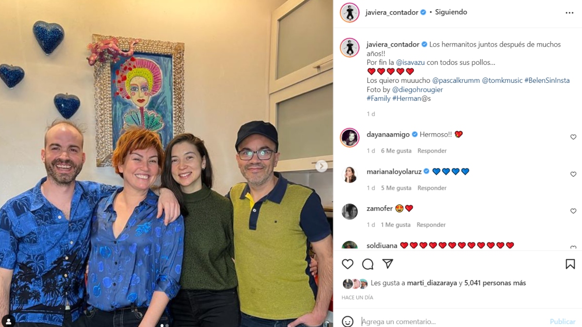 "Que lindos!!!", "Tu hija se parece al de lentes un poco", "Que linda familia tienes", "Que buena junta, hermanos bellos", "Bellos", "Son todos iguales!!!", "Buena!!!Que lindo todos juntos, muchos cariños a todos!!!", "Amor del bueno", "Tú hermano de lentes es igual a tu hija!! ♥️", fueron algunos de los mensajes de los seguidores de Javiera Contador.