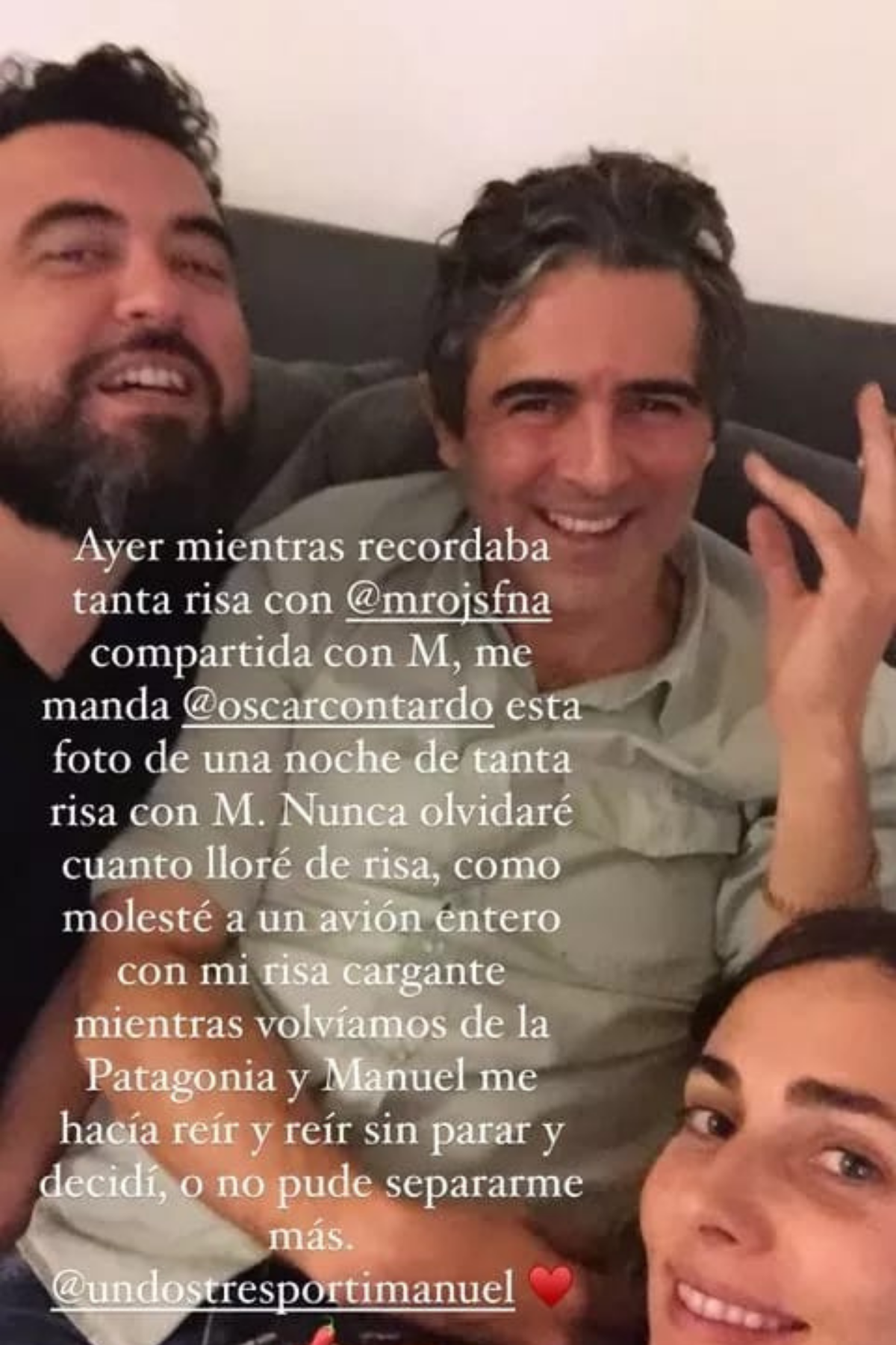 Donde señaló que fue una gran noche, debido a que "nunca olvidaré cuánto lloré de risa, como molesté a un avión entero con mi risa cargante mientras volvíamos de la Patagonia y Manuel me hacía reír y reír sin parar @undostresportimanuel", comentó.