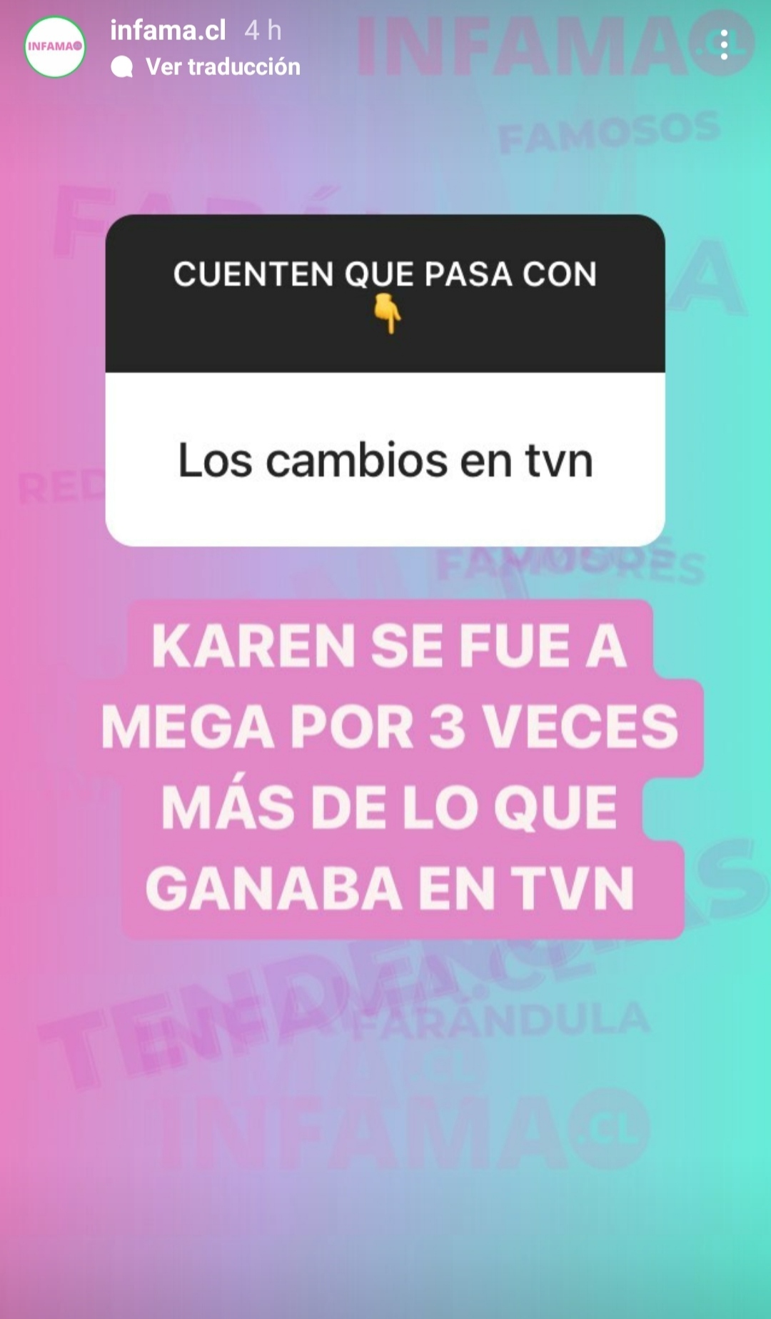 "Karen se fue a Mega por 3 veces más lo que ganaba en TVN", dio a conocer el sitio a través de una historia.