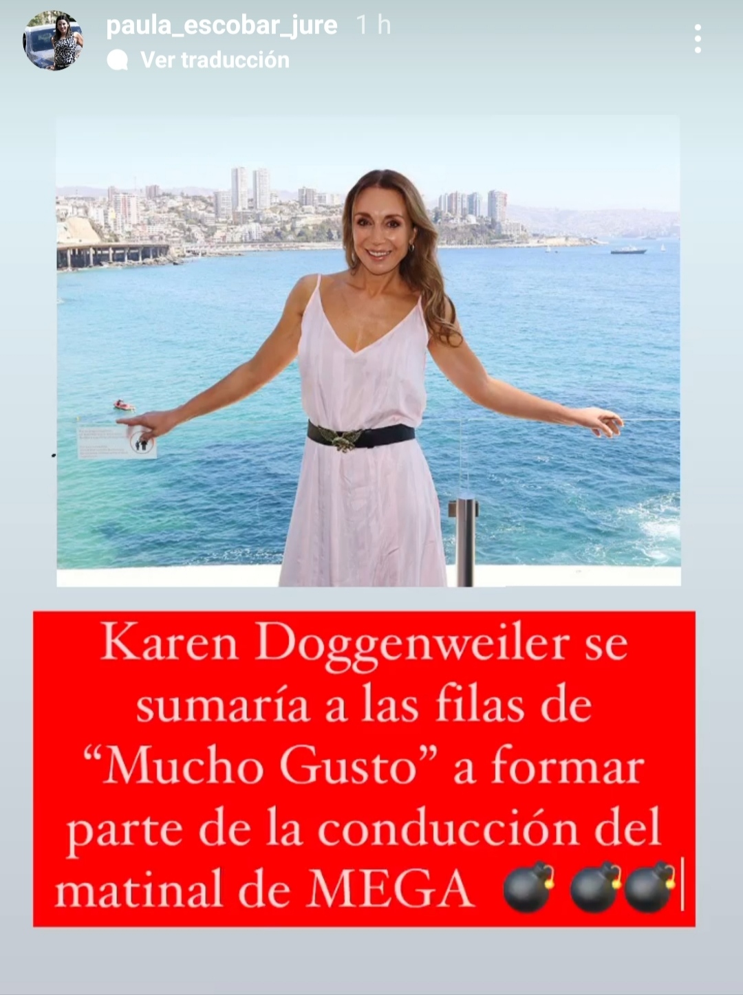 "Karen Doggenweiler se sumará a las filas de Mucho Gusto a formar parte de la conducción del matinal de Mega", comentó la comunicadora a través de una historia en su cuenta de Instagram.