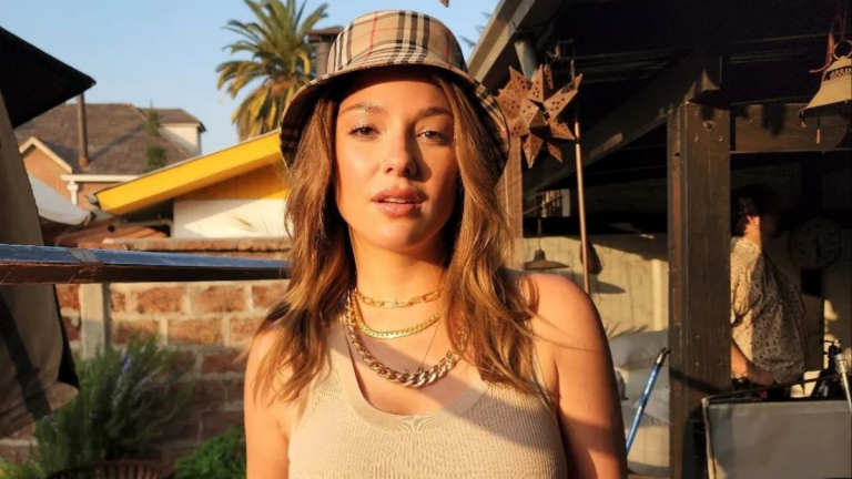 Aquí, la futura abogada luce un top beige junto con un pantalón blanco y un chaleco rosado cruzado en los hombros, coronando el atuendo con una mochila de una marca británica.