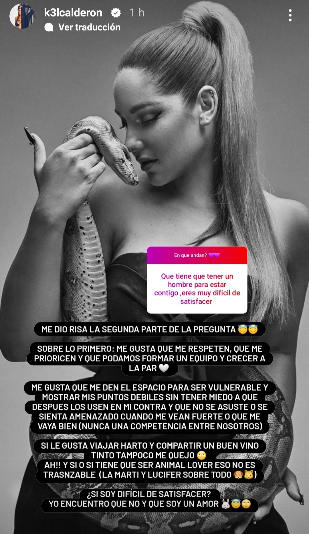 "Si le gusta viajar harto y compartir un buen vino tinto, tampoco me quejo. Ah! Y sí o sí tiene que ser animal lover, eso no es transable (la Marti y Lucifer sobre todo... ¿Si soy difícil de satisfacer? Yo encuentro que no y que soy un amor", agregó Kel Calderón.